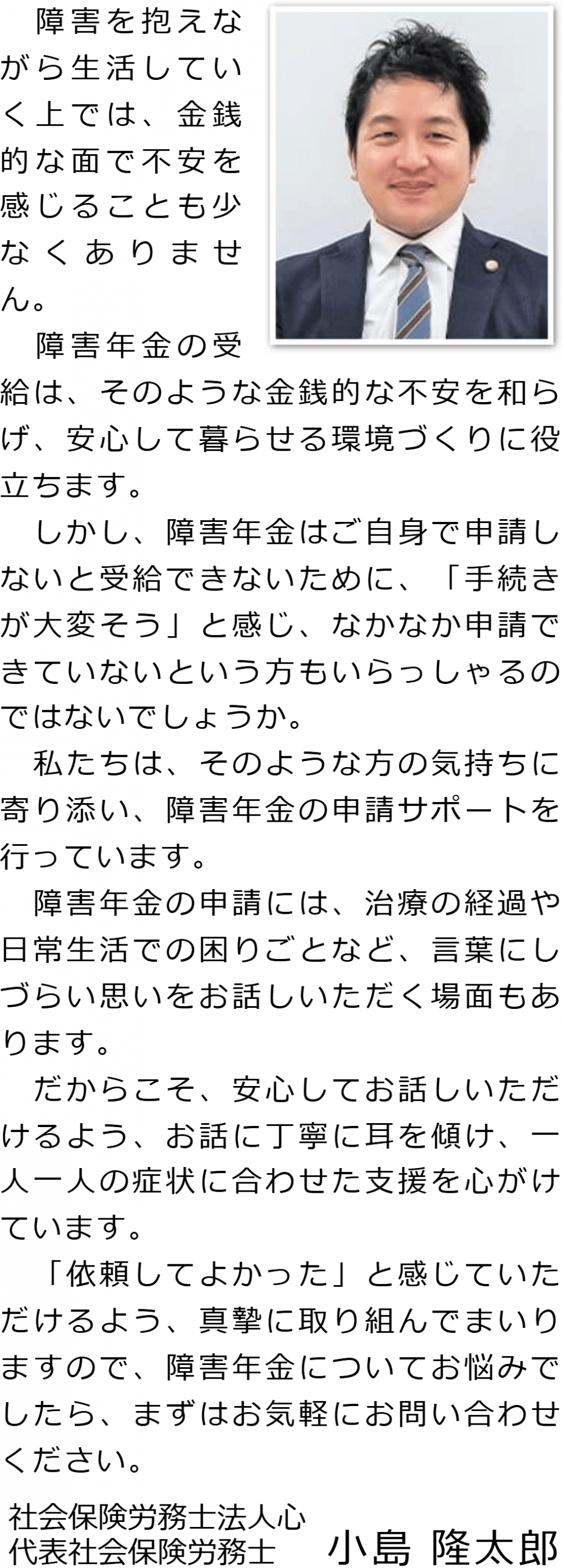 トップその他代表メッセージ 階層構造▼ その他(目次) 代表メッセージ その他(目次)その他トップ共通バナー※消さない障害年金無料診断サービス初めて障害年金を申請の方へ手続きの流れ代表メッセージ電話・テレビ電話相談について電話・テレビ電話相談の流れ心グループニュース(新着情報)お客様相談室費用の安さにこだわる理由関連リンク地域情報プライバシーポリシー 受付時間 平日 9時~21時、土日祝 9時~18時 夜間・土日祝の相談も対応します (要予約) 所在地 〒144-0051 東京都大田区西蒲田7-44-7西蒲田T・Oビル5F 0120-25-2403 お問合せ・アクセス・地図